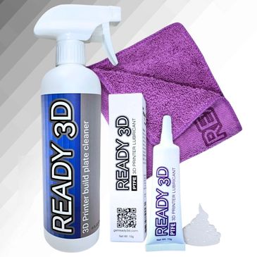 READY 3D printer build plate cleaner is formulated for use with READY 3D build plate adhesive. A machine washable 12"x12" microfiber cleaning cloth is included. READY 3D PTFE printer lubricant is a high-performance premium lubricant designed for precision 3D printing applications that provide optimal lubrication and wear resistance for 3D printers.